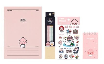 노트, 연필, 투명 스티커 그리고 스프링 수첩까지 알차게 구성되어 있으며, 어피치, 라이언등 귀여운 카카오 프렌즈 캐릭터 상품으로 아이들은 물론 부모님들도 좋아합니다.